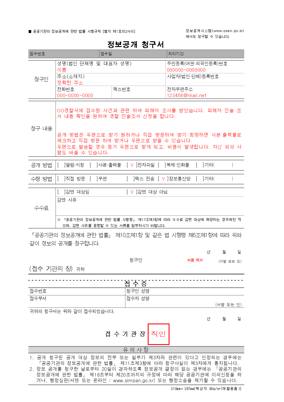 청구인의 이름·주민등록번호 및 주소 청구하는 정보의 내용, 정보형태, 공개방법 등