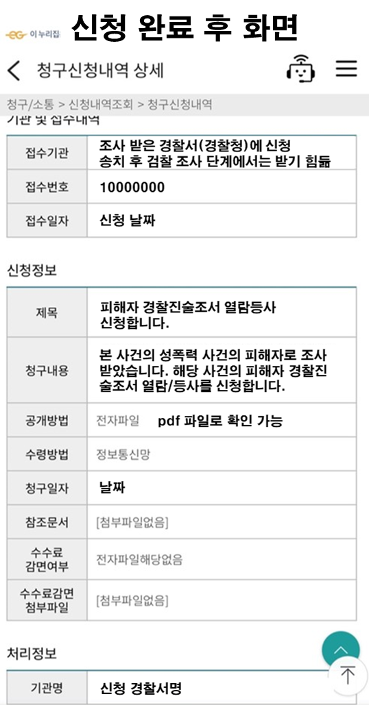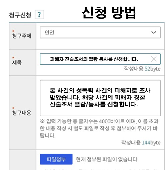 청구 내용은 본 사건의 성폭력 사건의 피해자로 조사 받았습니다. 해당 사건의 피해자 경찰진술조서 열람/등사를 신청합니다.