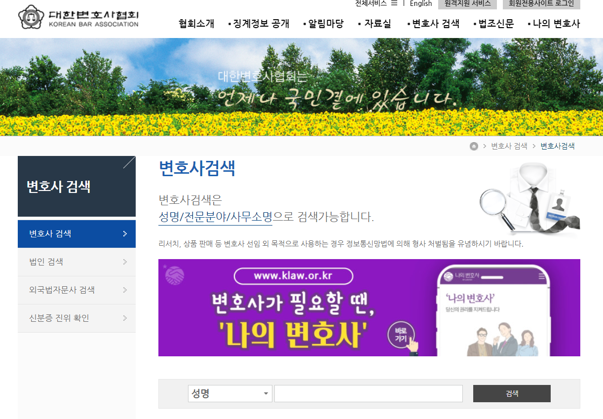 아직 누구인지 정해 지지 않았다면 이름을 넣지 않은 채 검색 버튼을 누르면 해당 변호사의 정보를 확인할 수도 있습니다.